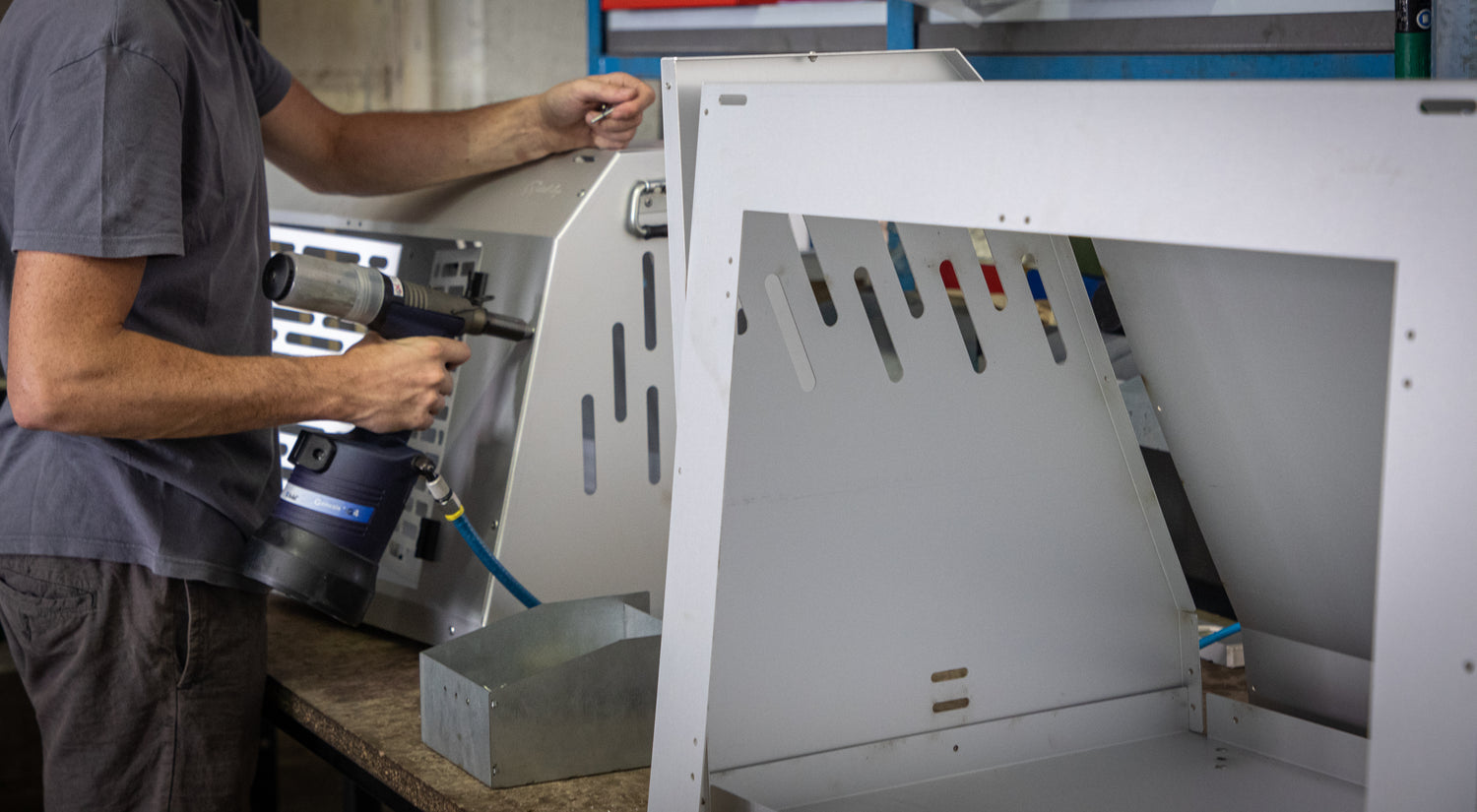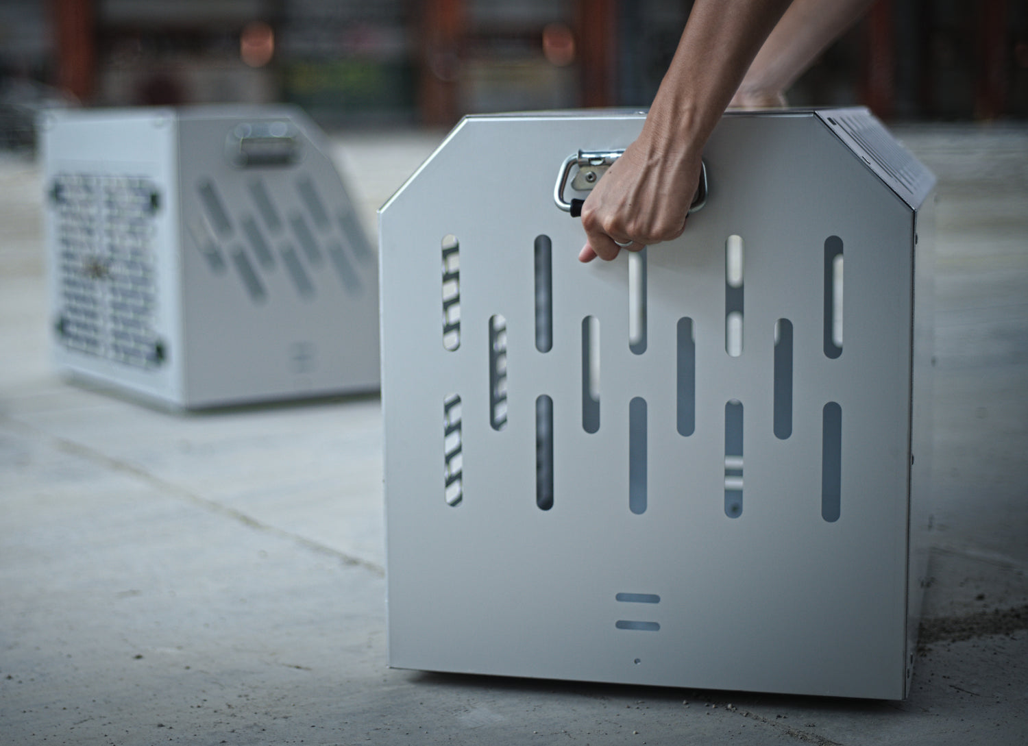 Tutti i nostri trasportini sono realizzati partendo da un’unica lamiera piana in alluminio anodizzato, che viene tagliata e forata con un processo di taglio laser, e in seguito piegata per raggiungere la forma desiderata e conferirle resistenza e rigidità strutturale. Le varie parti del kennel sono poi assemblate utilizzando rivetti strutturali in acciaio.